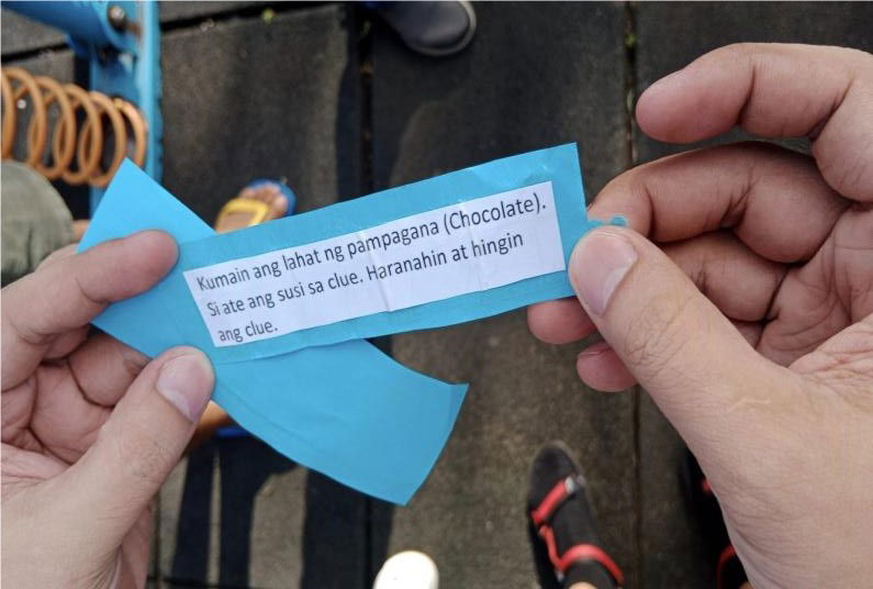 First clue: “Maglaro ng parang bata, at hanapin ang sunod na clue”. All participants quickly went to the Playground.